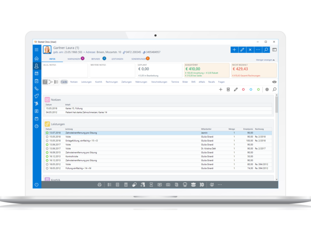 Das Karteikartendiagramm visualisiert Notizen, Leistungen, Termine, Bildern und Dokumente des Patienten in einer anschaulichen und leicht überblickbaren Form.